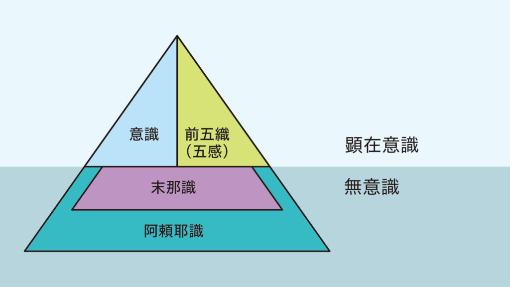 上半分の「顕在意識」の意識と五感に関しては、顕在的に観察することができますが、下半分の末那識と阿頼耶識に関しては、通常は認知できない無意識領域にあり、これはユング的に言えば集合的無意識のエリアになると言えます。