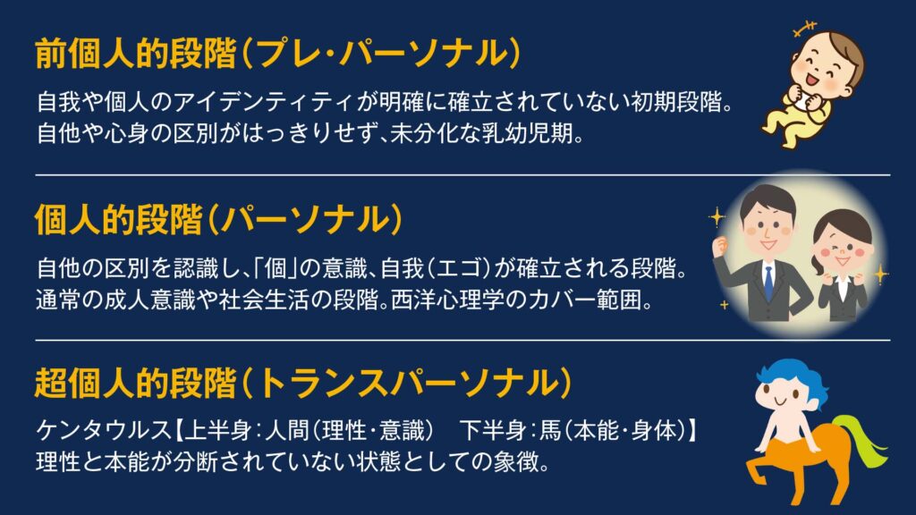 まず、前個人的段階(プレ・パーソナル)という意識状態は、人間の赤ちゃんなど、自我が確立される以前の状態です。