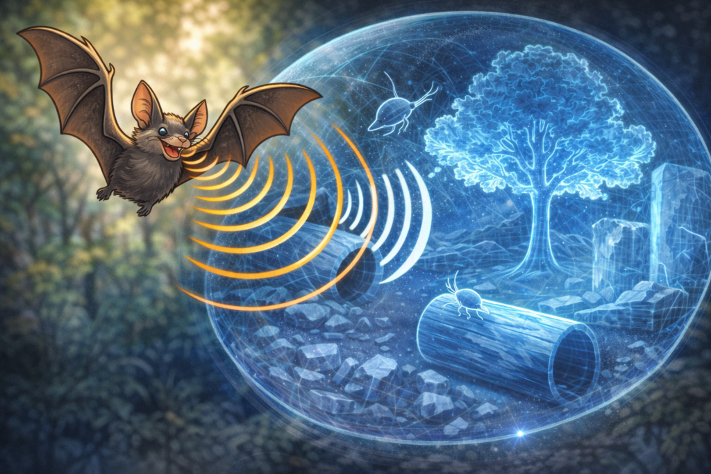かわりに彼らは聴覚が発達しており、自身が出した超音波の反射を聞き取り、音情報(音波)だけで頭の中に仮想空間を作っているハズです。