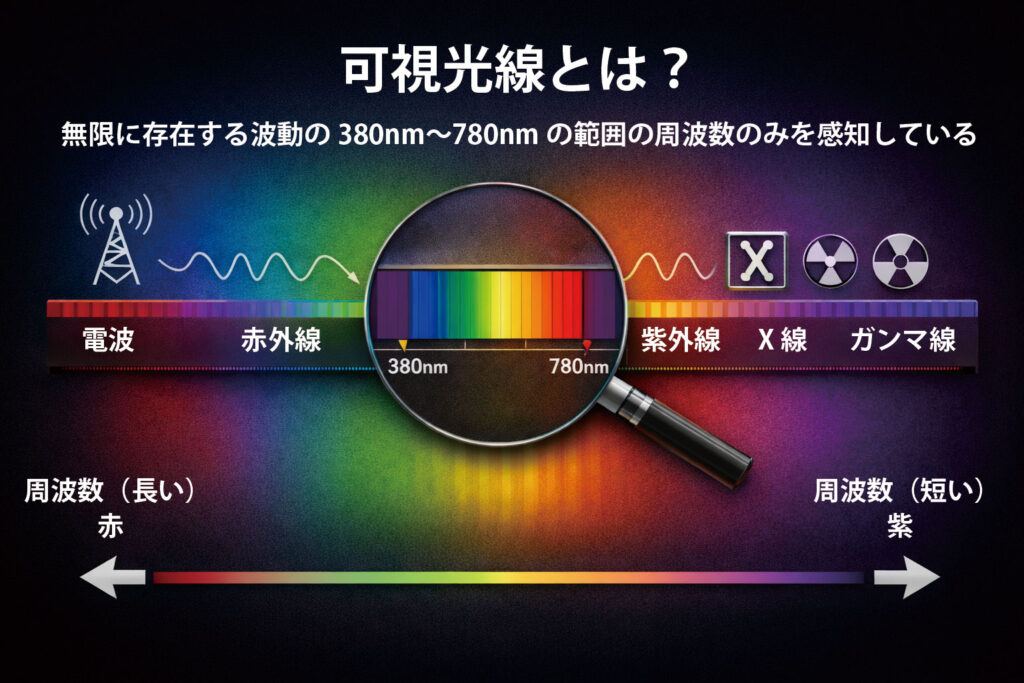 光とは電磁波ですが、電磁波のなかでも380nm〜780nm(ナノメートル)の範囲を可視光線と呼んでおり、わたしたちは非常に限定された電磁波の中でも、可視光線と呼ばれる周波数の波動しか感知する事はできません。